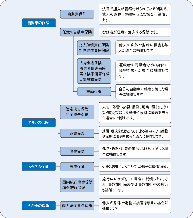 わたしたちの暮らしを支える損害保険は様々な種類があり、以下のような商品を扱っています。各保険会社によって商品名や商品内容が異なる場合がありますので、注意してください。
