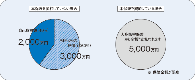 人身傷害保険(「人身傷害補償保険」という名称で販売されている場合もあります。)は、相手がいる事故か単独事故かを問わず、保険金額の範囲内で、保険約款に定める基準・計算方法に基づいて計算された損害額(治療費、休業損害など)を支払う(実損払いの)傷害保険です。また、自動車事故で当事者双方に過失がある場合については、通常、相手方から支払われる損害賠償金は過失相殺が加味されることとなりますが、この保険を契約していれば、過失相殺による減額をせずに、相手方からの損害賠償に先行して保険金を受け取ることができます。